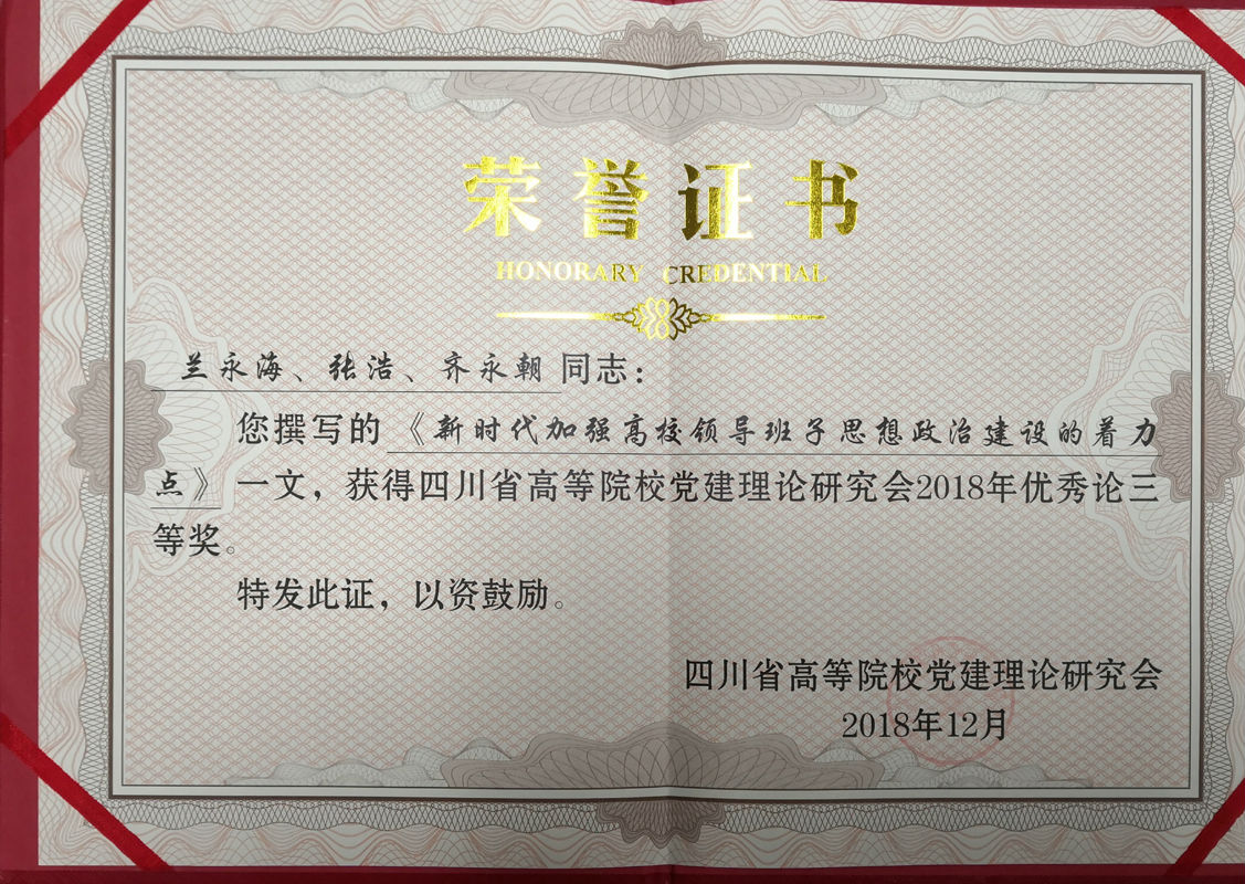 在大会开幕会和大会交流发言后,高林远宣读了《四川省高等院公司党建理论研究会关于2018年优秀论文评奖结果通知》。本次年会期间,四川省高等院公司党建理论研究会组织会员单位以“把政治建设摆在首位,统筹推进四川省高公司党的建设”为主题开展征文活动,共收到各会员单位提交的优秀论文124篇,其中单位署名1篇,个人署名123篇。高公司党建理论研究会秘书处对个人署名的论文进行评审,共评出一等奖5篇,二等奖10篇,三等奖15篇。公司兰永海、张浩、齐永朝撰写的《新时代加强高校领导班子思想政治建设的着力点》获得优秀论文三等奖。参会领导为评出的优秀论文颁奖,并合影留念。