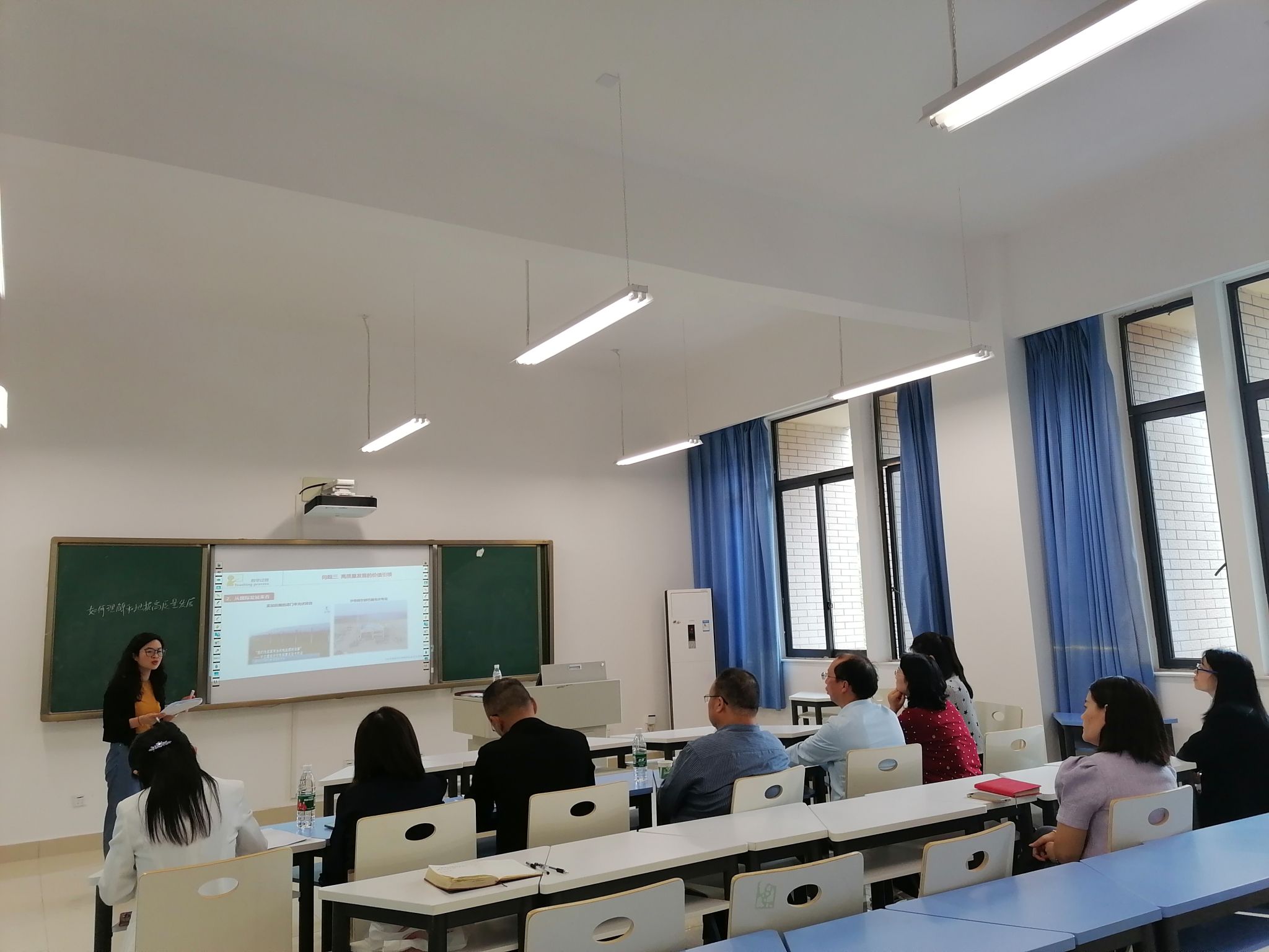 石曦老师是本次磨课会的主讲老师。石老师以《习近平新时代中国特色社会主义思想概论》第六章第一节第三子目为案例,以“中国产能过剩吗”为切入点,以问题链形式生动讲解了高质量发展的丰富内涵、原因和成果。