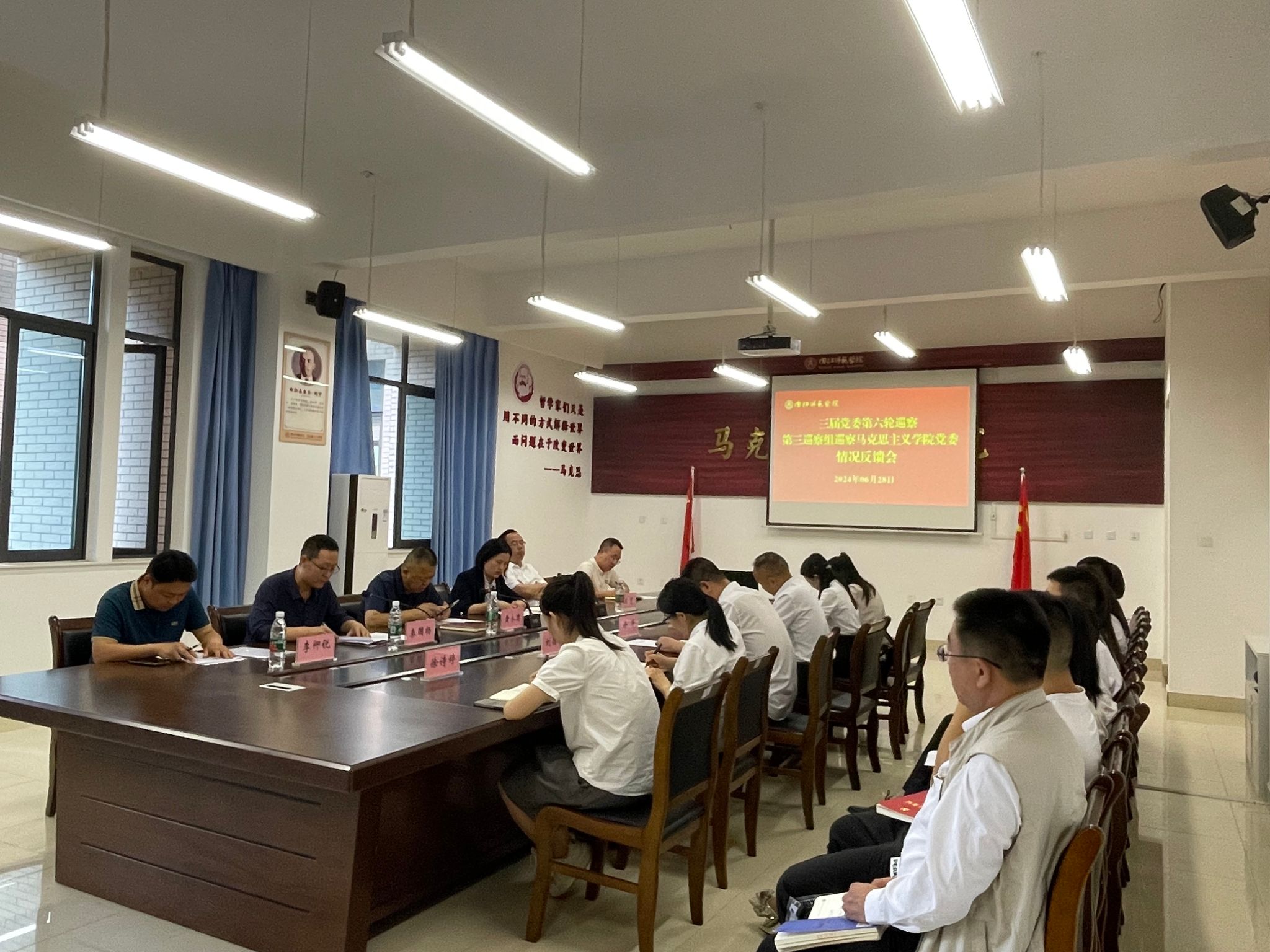 三届党委第六轮第三巡察组组长、副组长、联络员,纪委纪检监察室监督检查科科长,公司领导班子全体成员,党委委员,党政办、教科办负责人,教工党支部书记、教研室主任及党员教师代表出席会议。