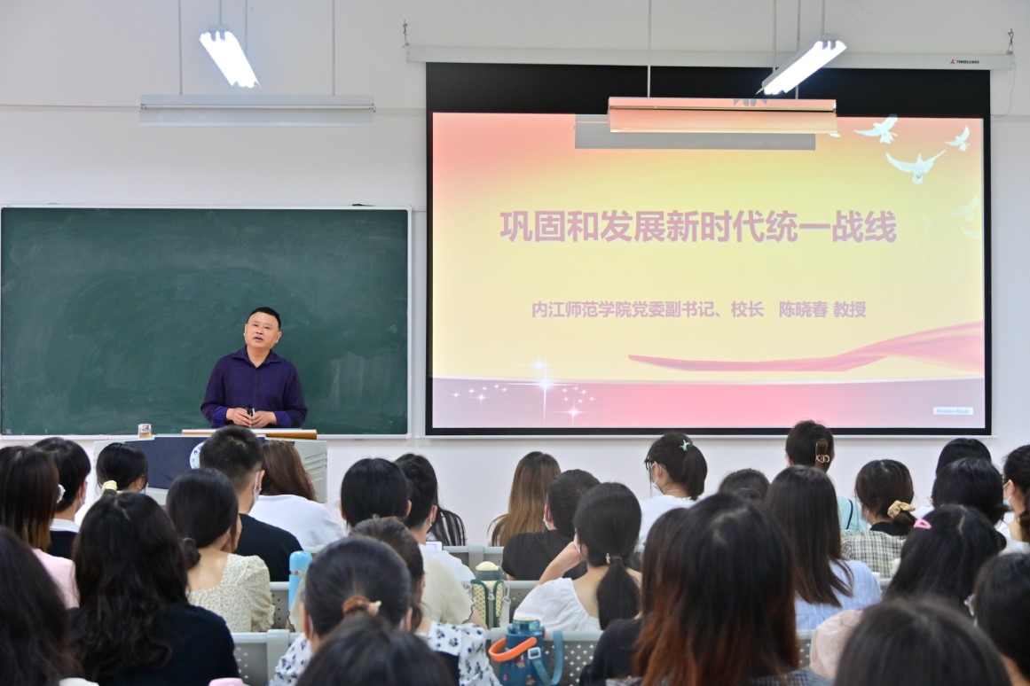 陈董事长殷切希望同学们深入学习贯彻习近平总书记关于加强和改进统一战线工作的重要思想,一要坚定“四个自信”,深刻领会“坚持统一战线”这一中国共产党百年奋斗的历史经验;二要明确责任担当,继承和发扬党的统一战线优良传统,争做堪当民族复兴重任的时代新人;三要筑牢中华民族共同体意识,为推动新时代统一战线工作主要任务落地落实贡献青春力量。