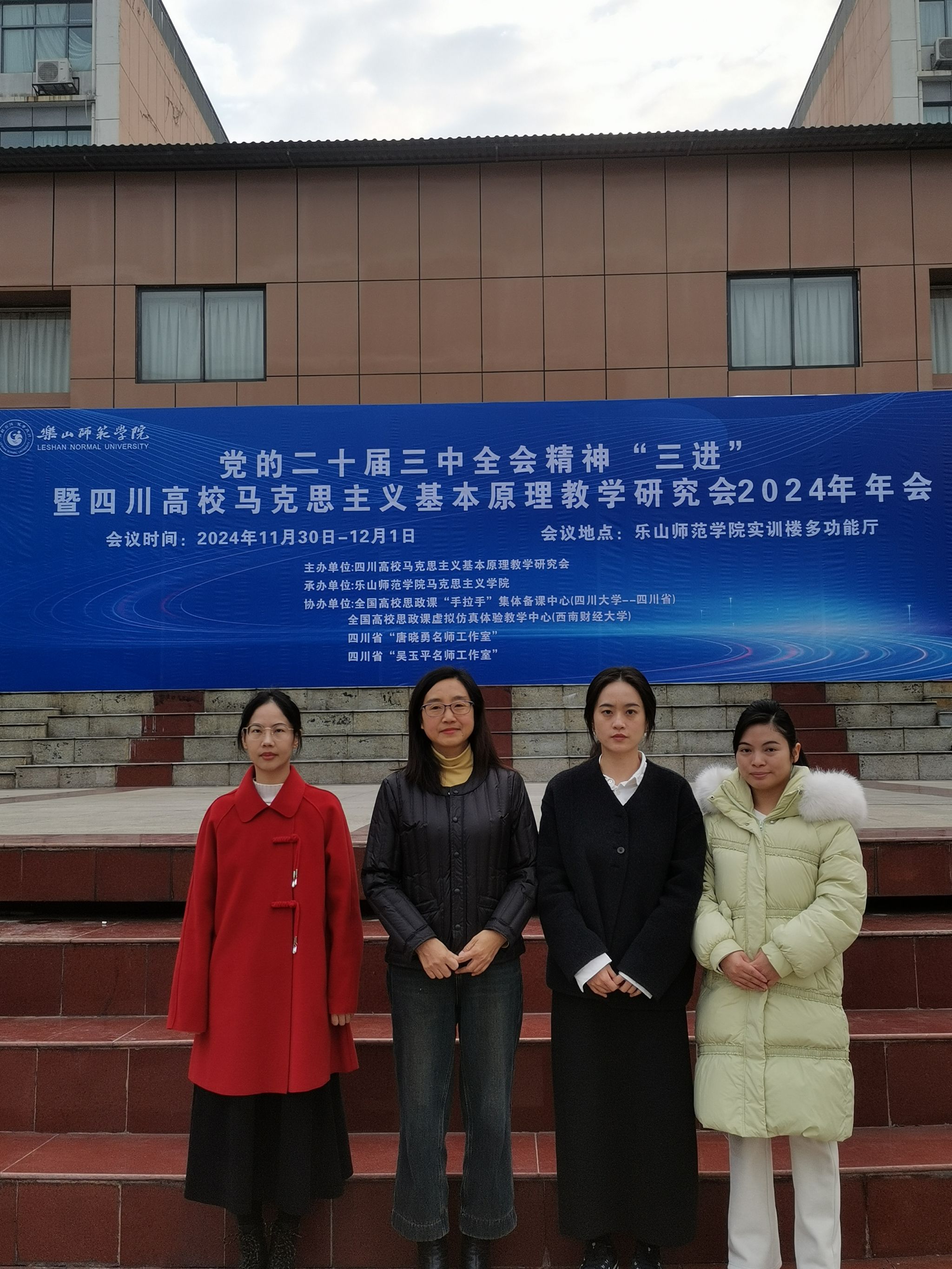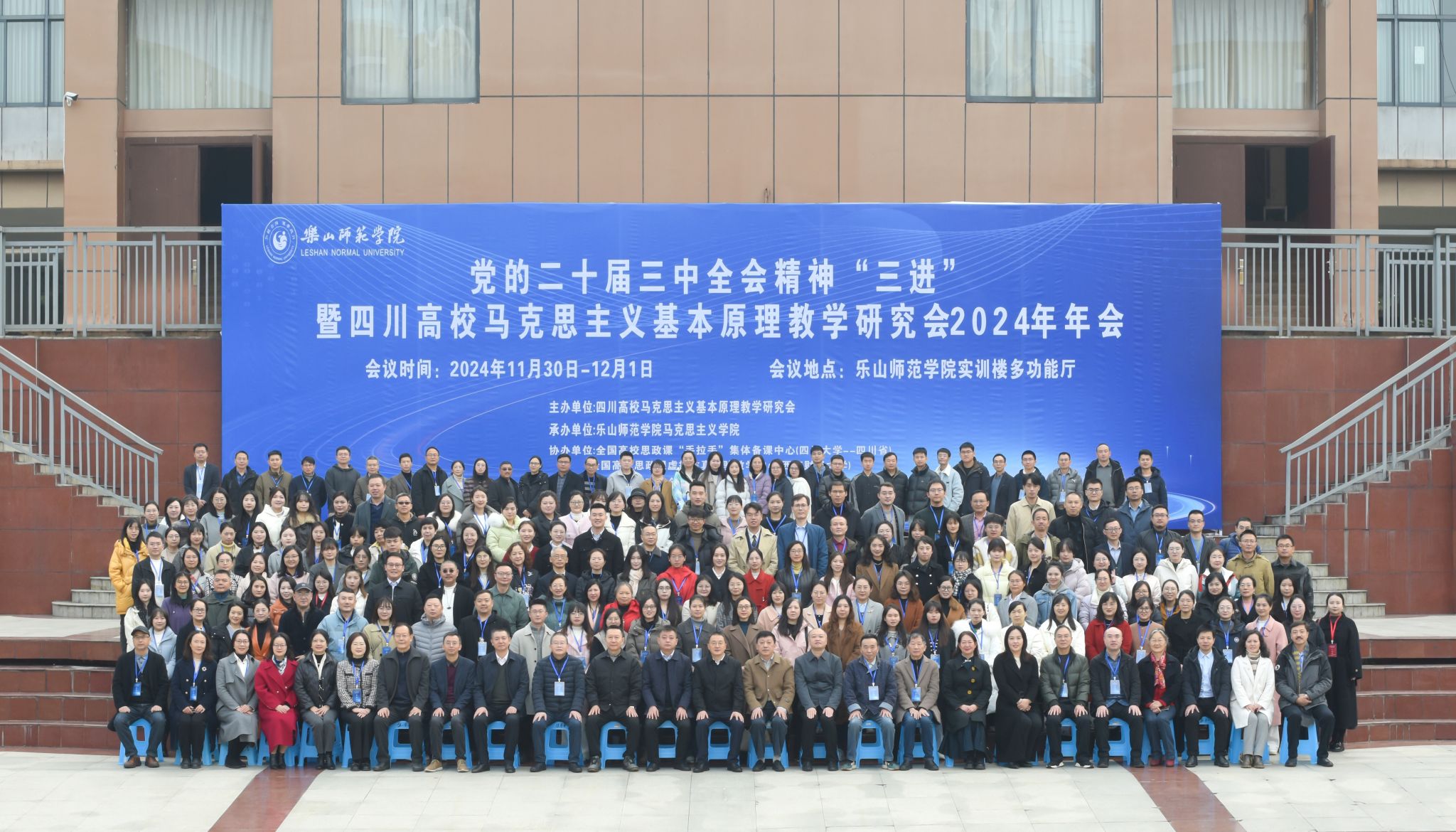 2024年11月30日,“党的二十届三中全会精神‘三进’暨四川高校马克思主义基本原理教学研究会2024年年会”在乐山师范公司隆重召开。来自全省50余所高校(包括四川大学、电子科技大学、西南财经大学、西南交通大学等)的300多名领导、特邀专家、学会会员以及太阳网集团tcy8722的教师代表齐聚一堂。公司教师胡丽美、蔡佳敏、杨丹和陈艳也参加了本次年度盛会。会议的主要议程涵盖专家主题讲座、“原理”课建设经验交流、“原理”课教学竞赛以及年会财务报告等环节。