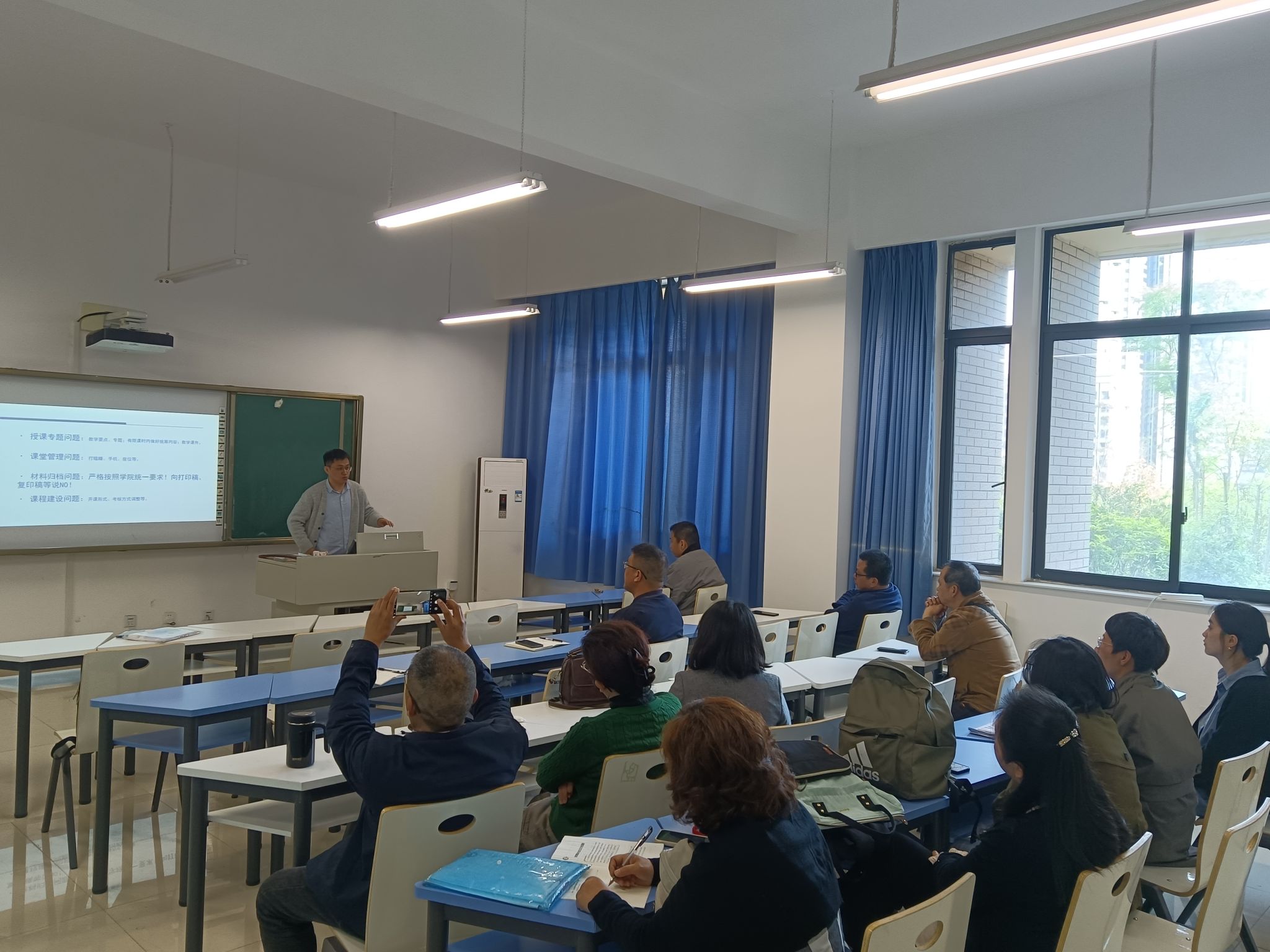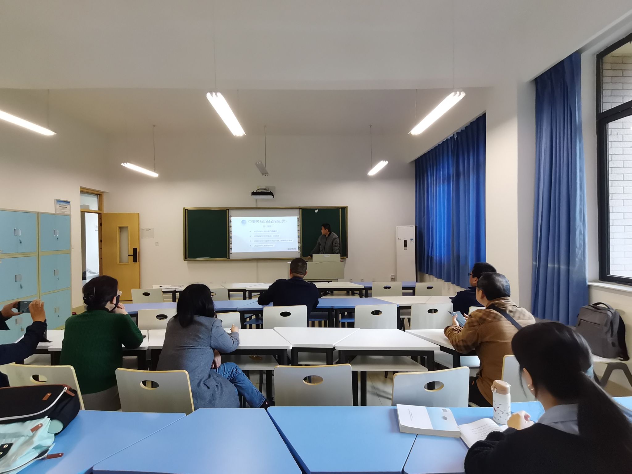 本次集体备课会分为两个部分。首先,柴菁铭、谢凯两位老师分别围绕《探寻新时期中美正确相处之道》《建设美丽中国的理与路》这两个专题进行了说课,重点介绍了各自教学专题的教学设计与思路、重难点等问题。与会老师们围绕两位老师的教学展示进行了交流和讨论,并就如何化解前期教学中遇到的难点、痛点等问题分享了各自的好做法、好经验。其次,谢凯老师向各位老师介绍了本学期的教学要点要求、课堂管理注意事项、课程材料的归档要求等。本次集体备课会现场气氛热烈,各位老师的深入讨论,为相关专题的教学拓展了思路、丰富了内容。