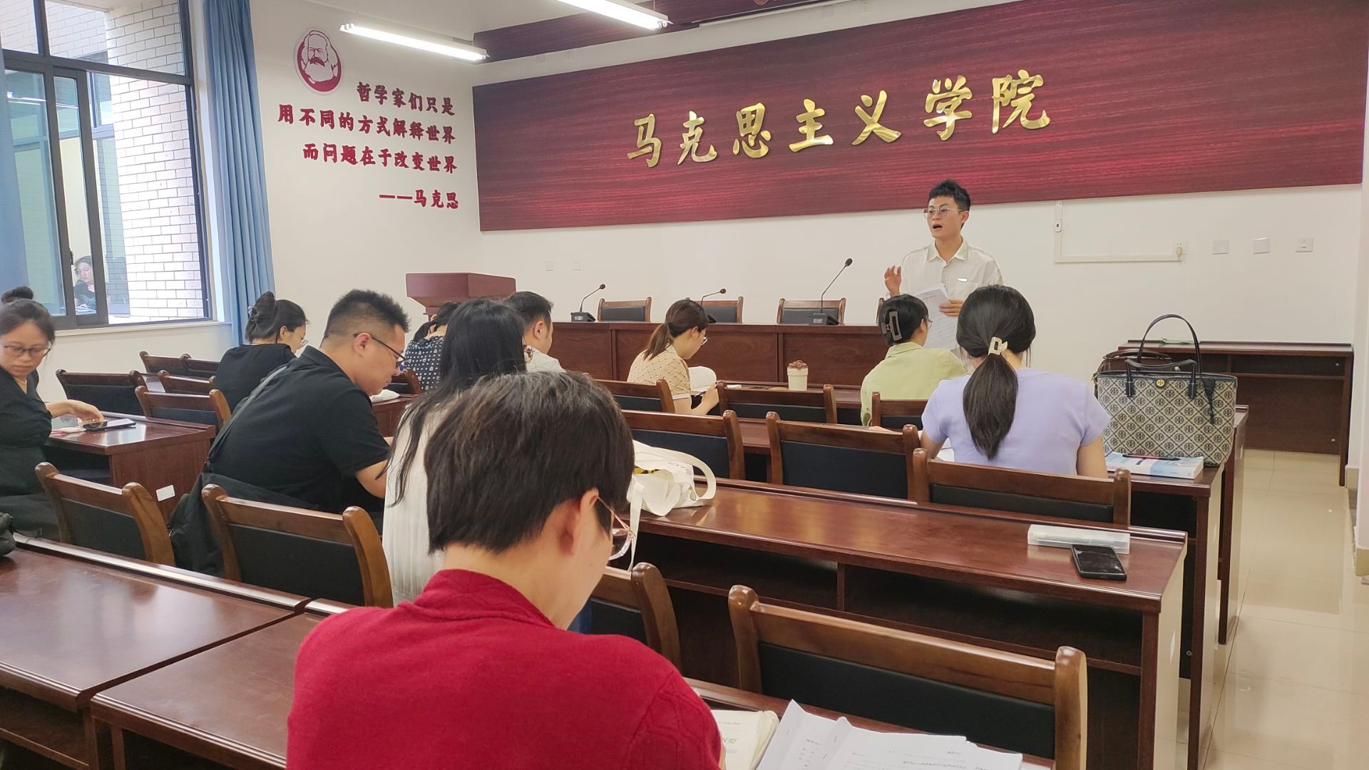 本学期的教学工作已经完成大部分,老师们首先就本学期未完成的教学内容即第十一、十二专题的教学重难点进行了讨论,最后达成共识并确定。随后龙老师汇报了第13周周四召开的员工座谈会的情况,传达了员工们对“中国近现代史纲要”课程的想法,对任课老师教学的建议以及对教学内容的关注点,老师们也对如何回应员工的心声进行了讨论。最后教研会还对即将到来的期末考核工作进行了一些安排和布置。