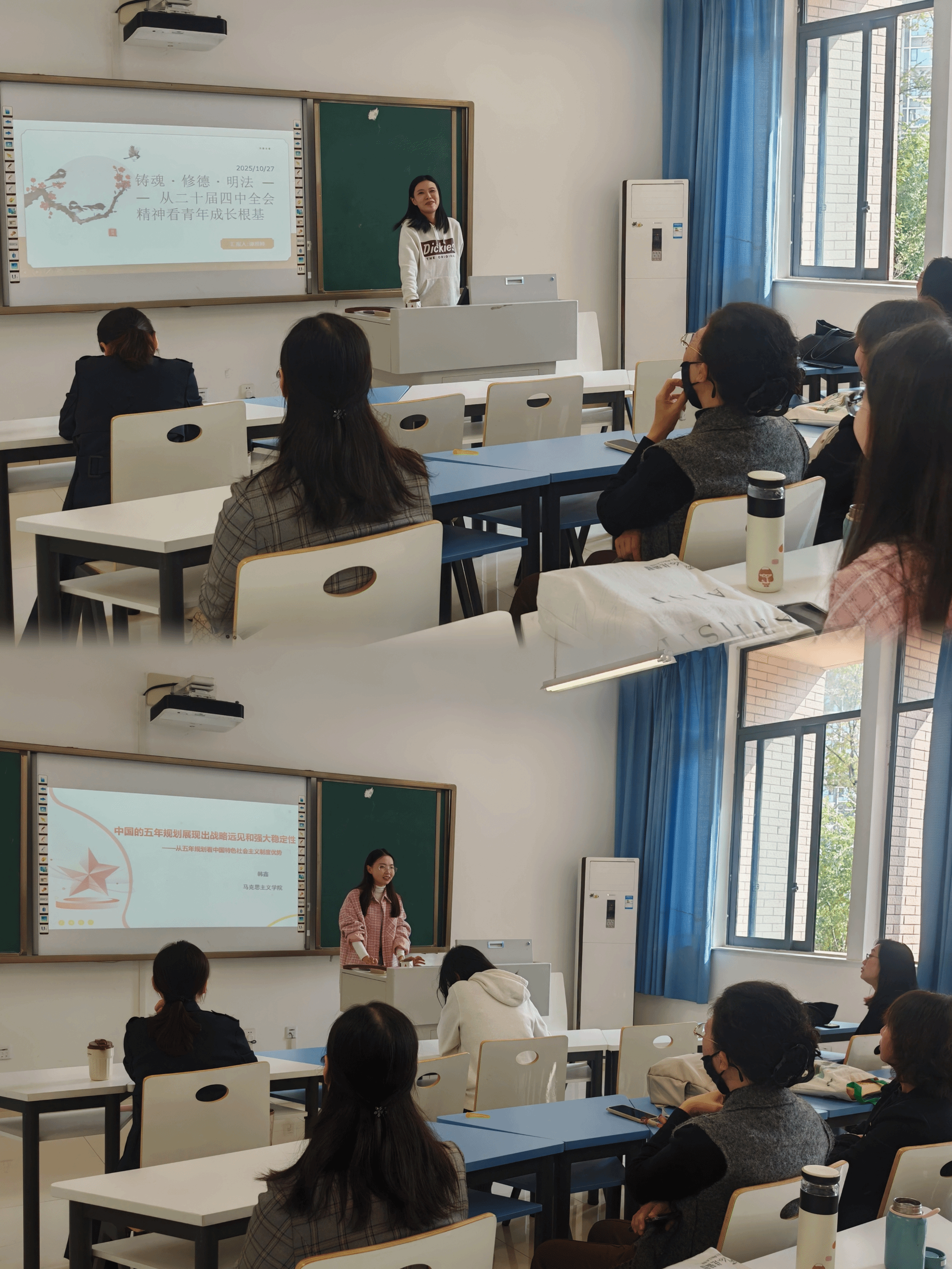 最后,胡静老师在总结中强调,学习贯彻全会精神是当前和今后一个时期的重要任务,全体教师需深入研读全会文件,精准把握精神实质,更自觉地将党的创新理论融入思政课堂。要以扎实的学理分析和丰富的教育素材,充分展现中国社会发展的重大成就,激励青年学子在中华民族伟大复兴的历史进程中勇担使命、为国奉献、为民服务。