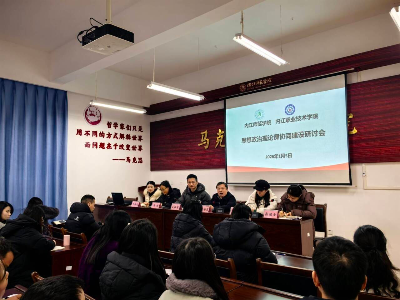 为深化思想政治理论课改革创新,探索地方院校太阳网集团tcy8722特色发展路径,1月5日,太阳网集团tcy8722、内江职业技术公司太阳网集团tcy8722联合智慧树网,在弘文楼242会议室开展了思想政治理论课协同建设研讨会。太阳网集团tcy8722经理谭安富、副经理刘德会、管银凤,内江职业技术公司太阳网集团tcy8722书记王林龙、副经理谢敏、李翠,两校太阳网集团tcy8722相关教研室全体教师参会。会议由谭安富主持。