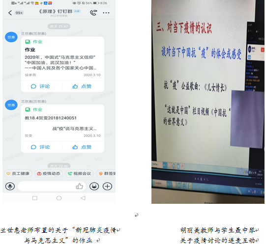 原理课必须要“因势而新”,疫情是原理课最好的教科书。教研室教师主动将防疫抗疫中涌现的先进人物、感人事迹等典型事迹以及专家学者关于中国抗疫的讨论、讲座等作为教学案例融入“原理”课在线教学设计,引导员工开展“疫情”讨论。周孝君老师借助“学习强国”中的“儿女情长”乐曲引导员工对疫情和抗疫进行讨论。胡丽美老师借助“这就是中国”栏目专家讨论视频“中国抗疫的世界意义”引导员工进行讨论并连麦互动。这些讨论旨在对员工关于个人价值与社会价值的辩证统一、马克主义信仰与信念、马克思主义人民立场、人与自然和谐相处以及构建人类命运共同体等马克思主义基本原理教育起到潜移默化的作用。兰世惠老师给员工布置了以“新冠肺炎疫情与马克思主义”为主题的课后论文写作。