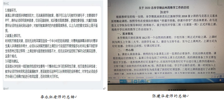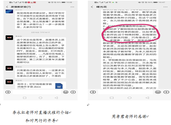 “钉钉在线教学”对于每一位教师都是一个挑战性的新尝试。为了便于在钉钉上及时分享教学资源、交流教学心得,教研室除了保留原有的“原理微信群”外,还专门建立了一个“原理钉钉群”作为集体备课平台。教师们在群里纷纷献言献策,相互开导,克服畏难、焦虑情绪,大多在两周之内熟悉了钉钉软件安装、调试、操作等流程。周孝君老师是具有30多年教室讲台教学经历的老教师,面临全新的网络远程直播教学,开始心里没底,表现出焦虑情绪。李永红老师相对熟悉网络技术,在群里热心地介绍操作流程,并开导她:“这个特殊时期,别指望别人帮你解决问题,只有靠自己,多试,多摸索,熟练了,其实也简单。” 在网上直播授课的准备期,为保证课堂直播的正常效果,周孝君、胡丽美、兰世惠等老师多次把“原理钉钉群”作为试播平台,并请其他老师提改进意见。为在直播中能与员工进行互动交流,兰世惠与胡丽美老师特意在群里扮演师生角色进行互动连麦排练。在大家的互帮互助下,《原理》课教研室教师迅速地熟悉了在线授课流程。