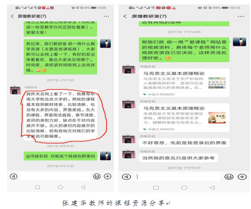 教研室本着从实际出发,一切有利于教学开展和保障教学效果的原则,针对《原理》课程内容和教学需要,在中国大学MOOC、智慧树、雨课堂、至善网等资源平台中进行优化选择,最终确定中国大学MOOC作为教研室教学的资源平台。张建华、胡丽美、李永红老师积极进入资源平台筛选授课资源并推荐给大家,胡丽美老师把遴选的教学视频录播下来分享给大家,赵宏荻老师分享了《原理》课电子版教材。教研室形成了资源共享、信息互通、预先谋划教学素材的良好局面。