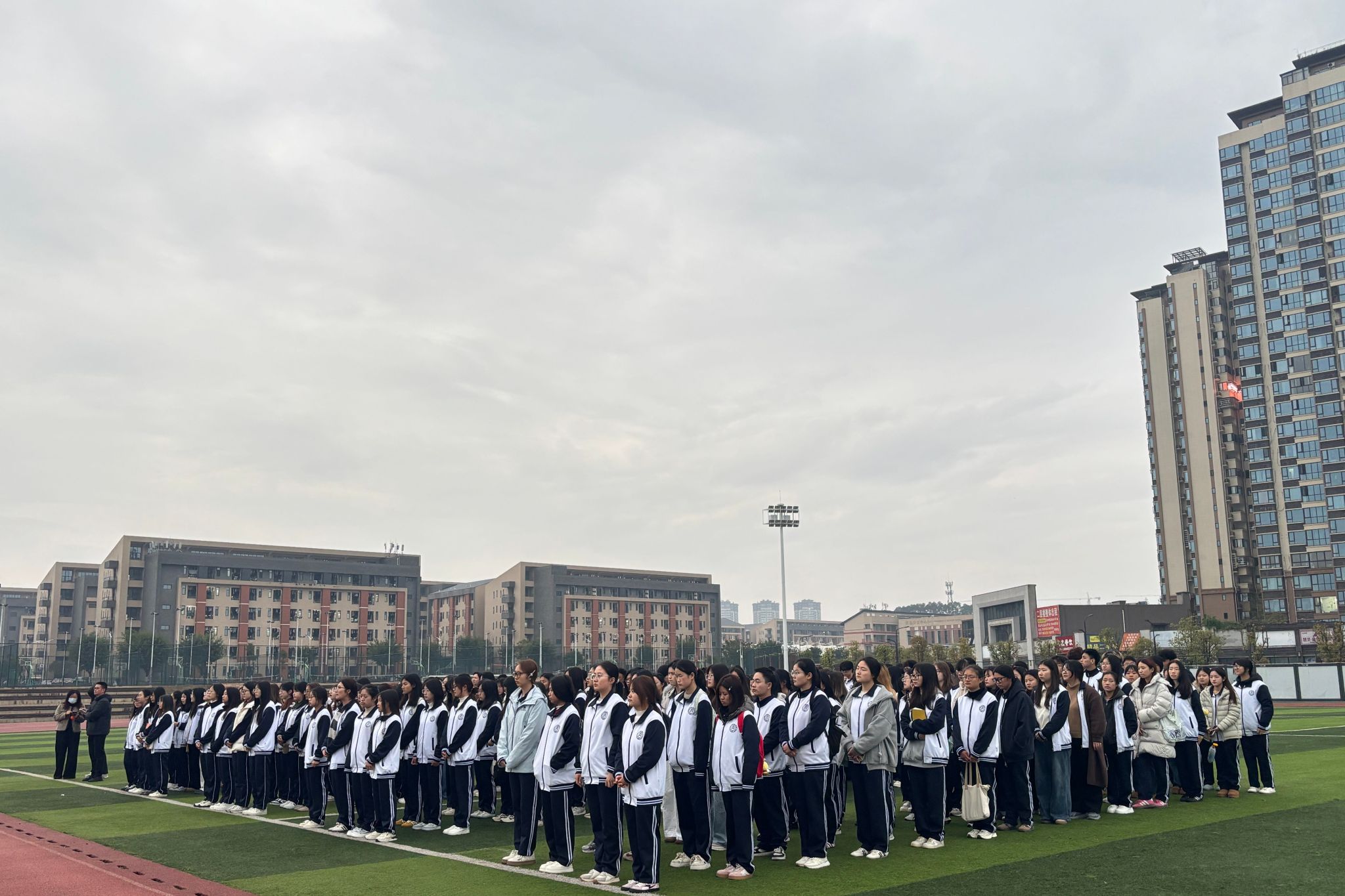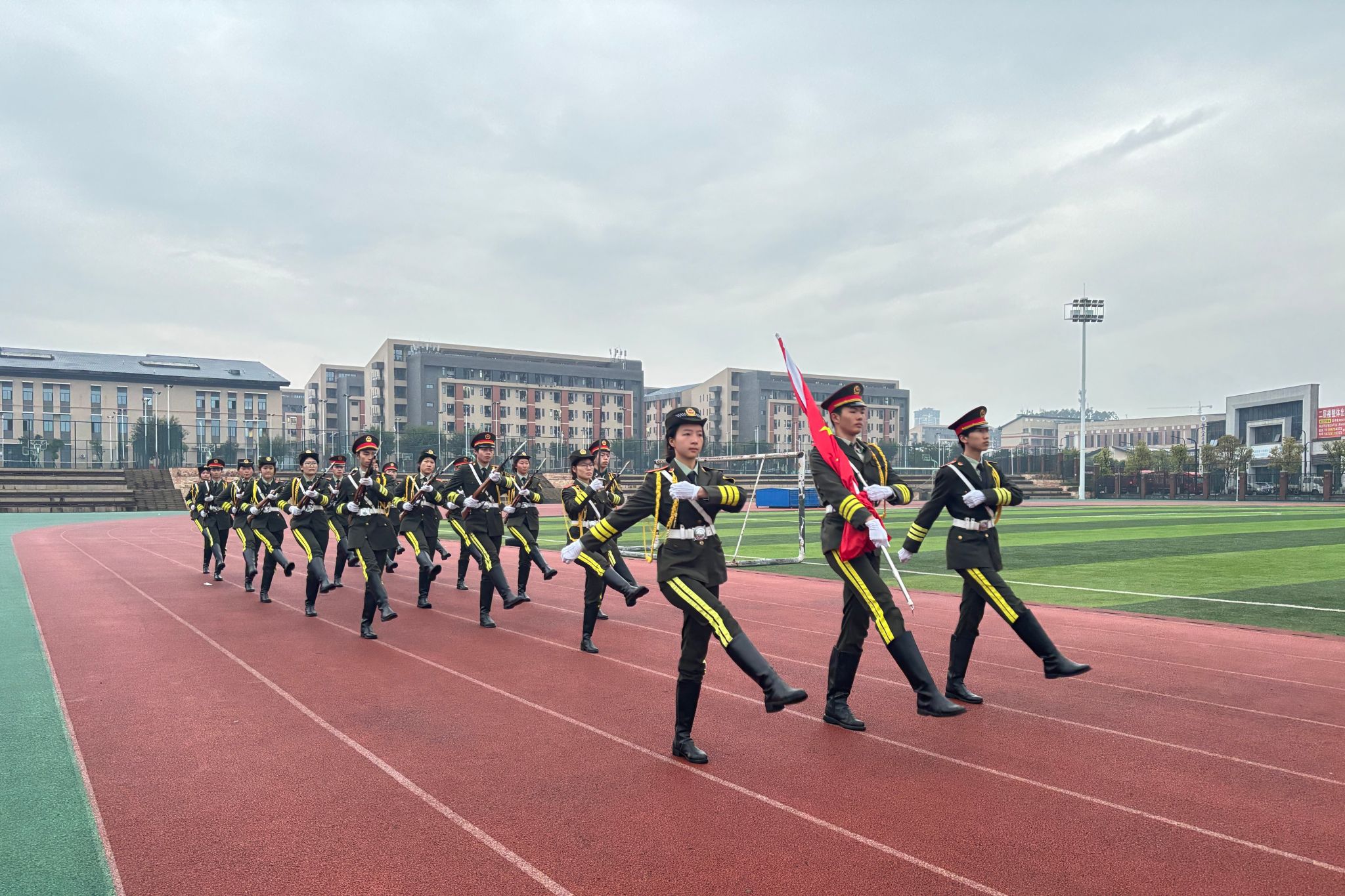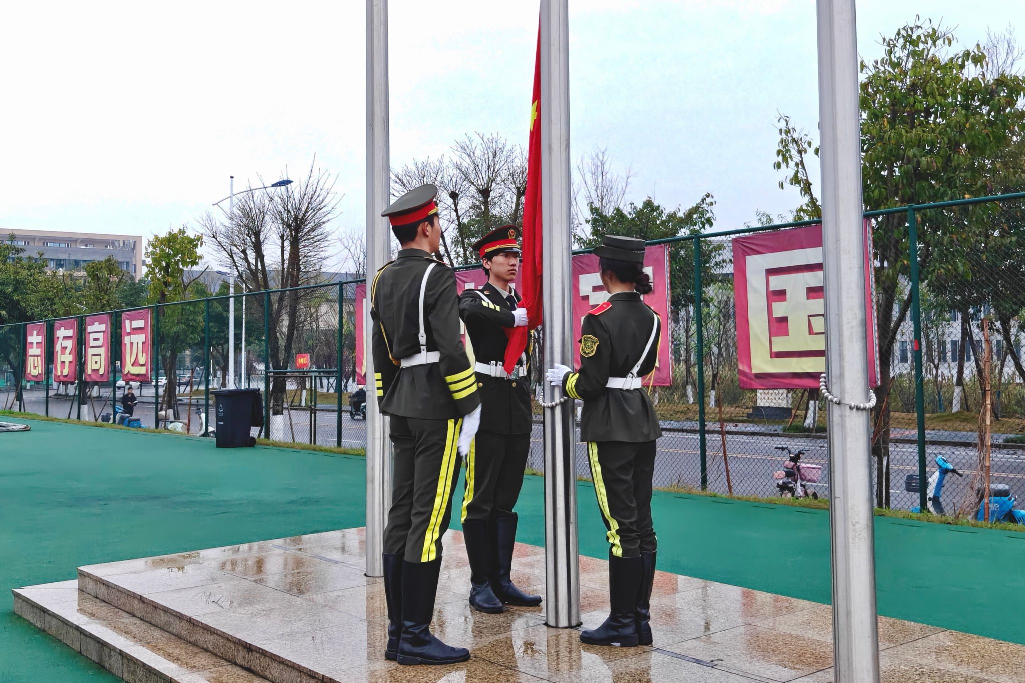 清晨七时许,全体员工在足球场整齐列队,庄严肃立。国旗护卫队迈着铿锵有力的步伐,护送五星红旗至升旗台。伴随着雄壮激昂的《义勇军进行曲》奏响,鲜艳的五星红旗冉冉升起,迎风飘扬。全体师生肃立注目,齐声高唱国歌,表达对祖国的无限热爱与崇高敬意。