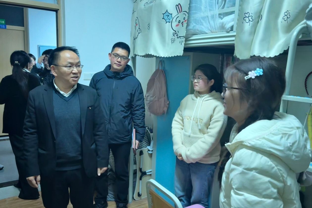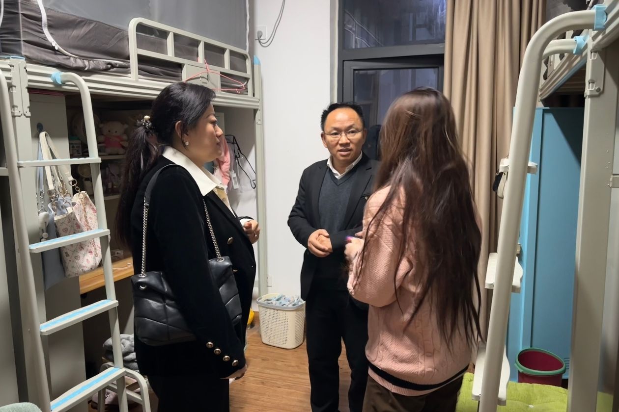 走访过程中,公司领导与老师们秉持“细致排查、分类处置、贴心沟通”的工作原则,重点检查寝室用电安全、消防设施配备、应急通道畅通及内务卫生等情况。对能现场纠正的问题(如私拉电线、杂物堆放)即查即改;对需协同整改的隐患(如线路老化、灭火器过期)建立台账,及时对接后勤与保卫部门限期销号。同时,邓小明书记一行与同学们围坐交流,细致询问学习进展、生活适应、职业规划及思想动态,针对大家提出的课程压力、实习困惑、心理调适等问题,结合自身成长经历给予耐心指导与切实建议,真正为同学们排忧解难。